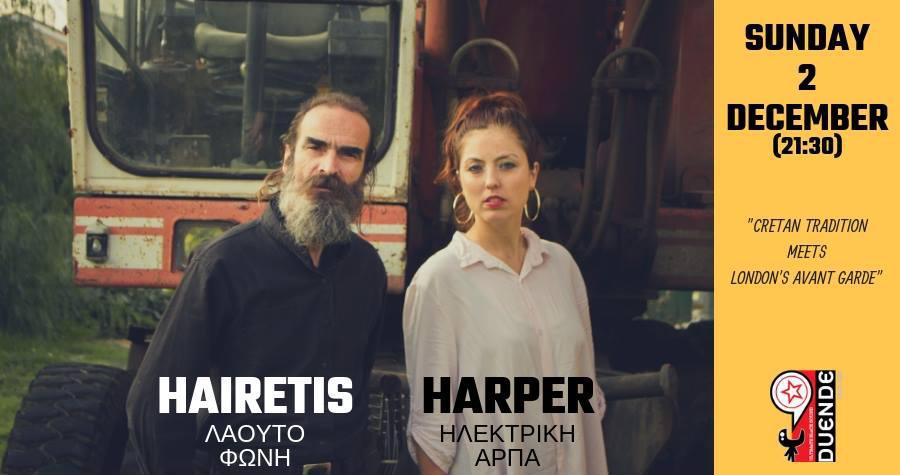 Η δεξιοτέχνης αρπίστα Maria-Christina Harper από το Λονδίνο και ο λαουτιέρης Γιάγκος Χαιρέτης από την Κρήτη, έρχονται για μία μοναδική συναυλία στο Duende Jazz Bar στη Θεσσαλονίκη, την Κυριακή 2 Δεκεμβρίου. Το πρωτότυπο ντουέτο συνδυάζει την μουσική παράδοση της Κρήτης με την πειραματική μουσική σκηνή του Λονδίνου. Τα ιδιαίτερα μουσικά τοπία που ο Χαιρέτης δημιουργεί με το λαούτο του, μπλέκουν με το δυναμικό και πειραματικό παίξιμο της Μαρίας-Χριστίνας στην ηλεκτρική της άρπα.