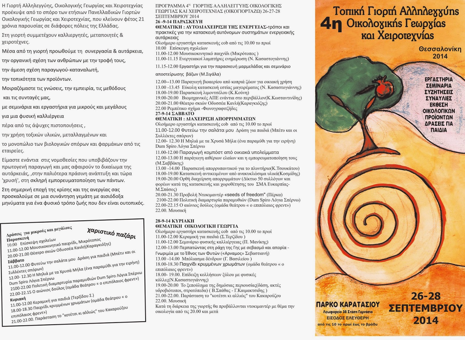 Στις 26-28 Σεπτεμβρίου 2014 θα πραγματοποιηθεί η 4η Τοπική Γιορτή Αλληλεγγύης Οικολογικής Γεωργίας και Χειροτεχνίας στο πάρκο Καρατάσιου στη Θεσσαλονίκη.