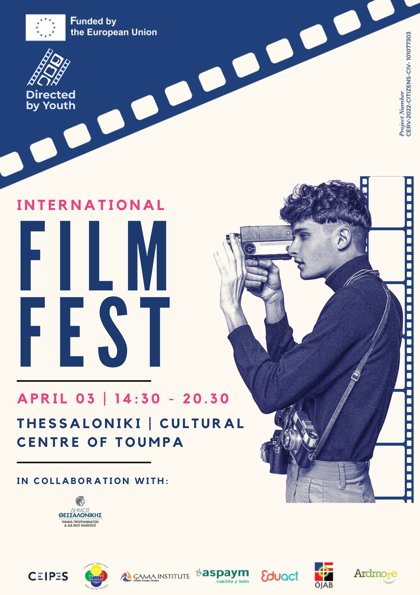 Η Eduact διοργανώνει με την Υποστήριξη και Συνεργασία του Δήμου Θεσσαλονίκης στα πλαίσια Ευρωπαϊκού έργου ένα Διεθνές Φεστιβάλ Κινηματογράφου για νέους στο Πολιτιστικό Κέντρο Τούμπας την Τετάρτη 03/04/2023, 14.30-20.30. Στο Φεστιβάλ θα συμμετέχει νεολαία (μαθητές και φοιτητές) από Ιταλία, Ιρλανδία, Ισπανία, Ρουμανία, Βουλγαρία, Ολλανδία και φυσικά Ελλάδα.