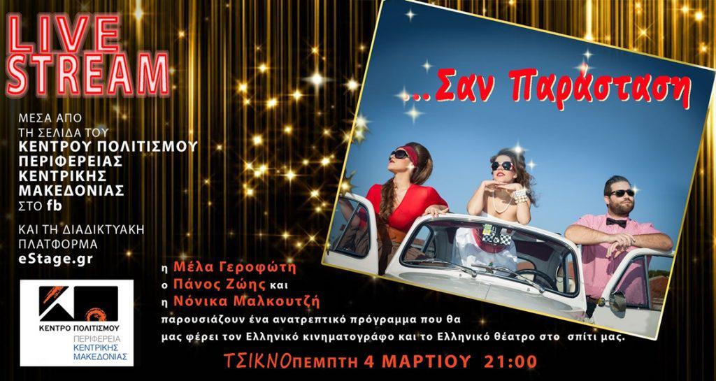 Την βραδιά της Τσικνοπέμπτης 4/3, τη σκυτάλη θα πάρουν επτά εξαιρετικοί μουσικοί, τραγουδιστές και ηθοποιοί σε ένα ανατρεπτικό πρόγραμμα «Σαν παράσταση» που θα μας φέρει τον Ελληνικό κινηματογράφο και το Ελληνικό θέατρο στο σπίτι μας. Μια μουσικοθεατρική παράσταση, βασισμένη σε διαχρονικά και πολυαγαπημένα τραγούδια του ελληνικού θεάτρου και κινηματογράφου.