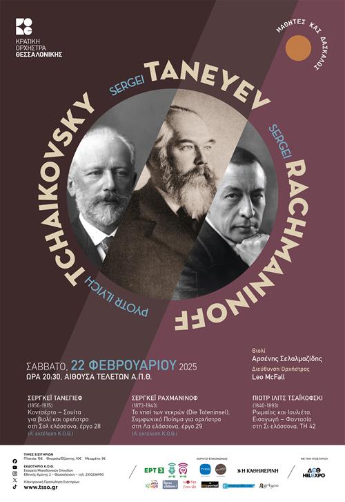 Θα παρουσιαστούν κομμάτια των: Σεργκέι Τανέγιεφ, Σεργκέι Ραχμάνινοφ και Πιοτρ Ίλιτς Τσαϊκόφσκι Διεύθυνση Ορχήστρας: Leo McFall Βιολί: Αρσένης Σελαλμαζίδης Πρόγραμμα: Σεργκέι Τανέγιεφ (1856-1915): Κοντσέρτο – Σουίτα για βιολί και ορχήστρα σε σολ ελάσσονα, έργο 28 (Α’ εκτέλεση Κ.Ο.Θ.) Σεργκέι Ραχμάνινοφ (1873-1943): Το νησί των νεκρών, Συμφωνικό Ποίημα για ορχήστρα σε λα ελάσσονα, έργο.29 (Α’ εκτέλεση Κ.Ο.Θ.) Πιοτρ Ίλιτς Τσαϊκόφσκι (1840-1893): Ρωμαίος και Ιουλιέτα, Εισαγωγή – Φαντασία σε σι ελάσσονα, TH 42 Παραγωγή Κ.Ο.Θ. Αίθουσα Τελετών Α.Π.Θ.