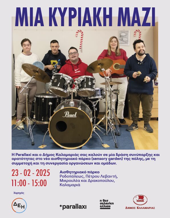Η δράση της Parallaxi, στο πλαίσιο του αστικού πειράματος «Η Θεσσαλονίκη Αλλιώς» και του Δήμου Καλαμαριάς, στο νέο Αισθητηριακό Πάρκο (sensory garden) που τη συγκεκριμένη μέρα γιορτάζει με διάφορες δράσεις συμπερίληψης και ορατότητας για άτομα με αναπηρία, αλλά και μη. Στόχος μας η δράση αυτή να αποτελέσει το σάλπισμα για κινητοποίηση, ανάδειξη και κυρίως συμμετοχή στην προσπάθεια να γίνει αυτό το πάρκο μέρος της ζωής τους και της ζωής μας. Το Πάρκο διαθέτει μια παιδική χαρά με όλα τα στοιχεία του κοινού πάρκου (φυτεύσεις, παγκάκια, παιχνίδια κλπ) για όλους τους κατοίκους της περιοχής και ταυτόχρονα διαθέτει και ειδικά παιχνίδια (πρωτότυπα και όχι συνηθισμένα) για άτομα με αναπηρίες.