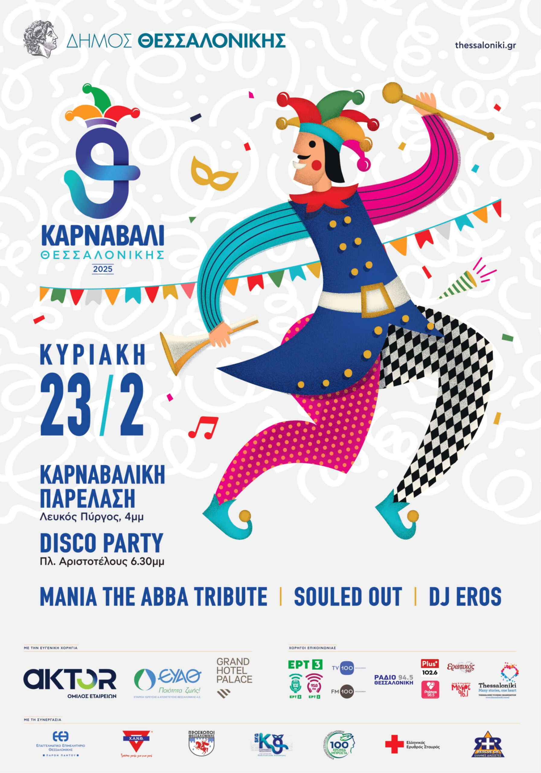 Το Καρναβάλι Θεσσαλονίκης έρχεται την Κυριακή 23 Φεβρουαρίου με ένα μοναδικό disco party στην πλατεία Αριστοτέλους και μια μεγάλη Καρναβαλική Παρέλαση, όπου είναι προσκεκλημένοι όλοι οι Θεσσαλονικείς για να διασκεδάσουν, να χορέψουν και να τραγουδήσουν.