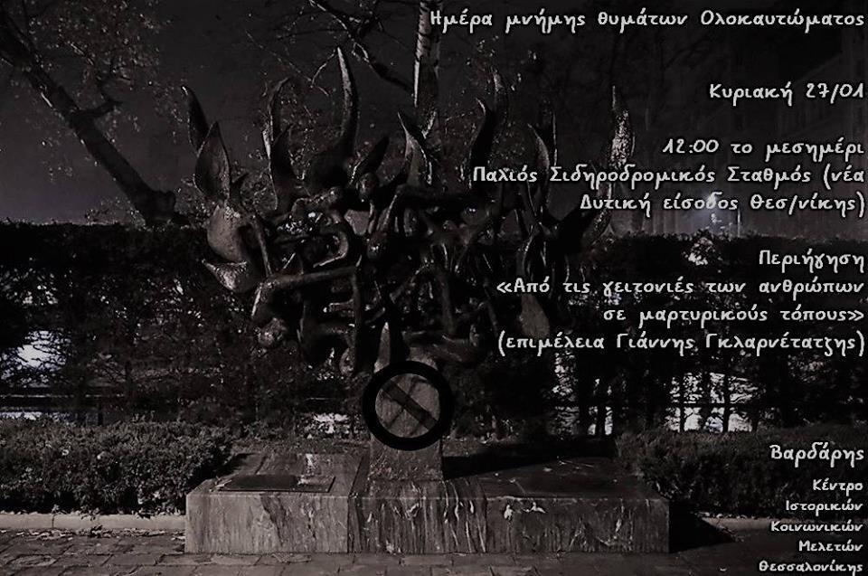 Το Κέντρο Κοινωνικών Ιστορικών Μελετών Θεσσαλονίκης «Βαρδάρης», στο πλαίσιο της ημέρας μνήμης των θυμάτων Ολοκαυτώματος, και μετά από μια χρονιά αλλεπάλληλων βεβηλώσεων του μνημείου του Ολοκαυτώματος στην πλατεία Ελευθερίας, σας προσκαλεί την Κυριακή 27 Ιανουαρίου 2019 στην περιήγηση: «Από τις γειτονιές των ανθρώπων στους μαρτυρικούς τόπους», με αφετηρία τον Παλιό Σιδηροδρομικό Σταθμό, από όπου έφευγαν τα τρένα του θανάτου για το Άουσβιτς. Με οδηγό τον Γιάννη Γκλαρνέτατζη θα αναζητήσουμε τα ίχνη της παρουσίας, αλλά και της απουσίας, της εβραϊκής κοινότητας της πόλης.
