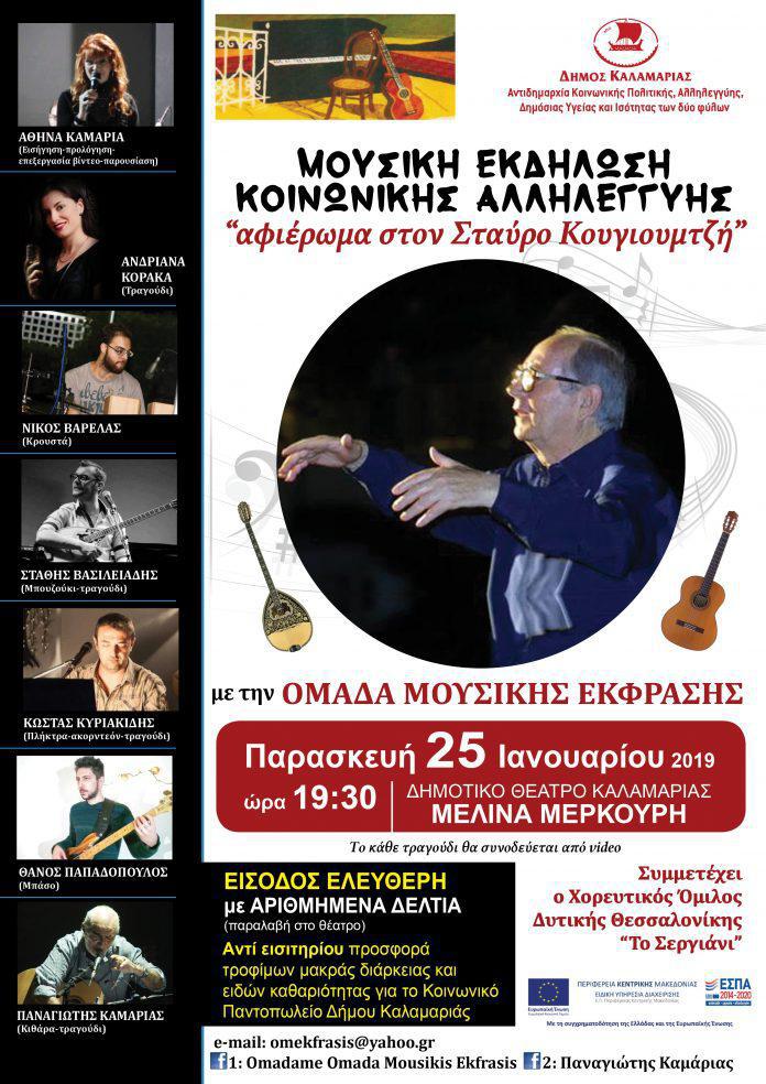 Η μουσική παράσταση, είναι αφιερωμένη στον μεγάλο συνθέτη Σταύρο Κουγιουμτζή και φιλοδοξεί να δώσει ένα δυνατό μήνυμα υποστήριξης, ενότητας κι αλληλεγγύης. Στην παράσταση συμμετέχει και ο Χορευτικός ΄Ομιλος Θεσσαλονίκης «Το Σεργιάνι», ενώ κάθε τραγούδι θα συνοδεύεται από video. Σκοπός της συναυλίας είναι να συγκεντρωθούν τρόφιμα μακράς διάρκειας και είδη ατομικής υγιεινής, τα οποία θα διατεθούν στο Κοινωνικό Παντοπωλείο του Δήμου.