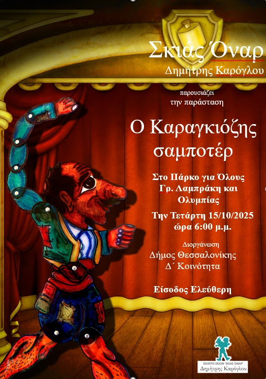 Ο Δήμος Θεσσαλονίκης και η Δ’ Δημοτική Κοινότητα προσκαλούν μικρούς και μεγάλους σε μια μοναδική βραδιά θεάτρου σκιών, με την παράσταση «Ο Καραγκιόζης σαμποτέρ» από την ομάδα παραστατικής και εικαστικής δημιουργικότητας «Σκιάς Όναρ».