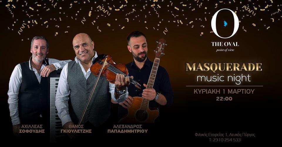Masquerade Music Night Live στο Oval την Κυριακή 01 Μαρτίου με τους Θάνο Γκιουλετζή, Αχιλλέα Σοφούδη και τον Αλέξανδρο Παπαδημητρίου συναντιούνται στην σκηνή του Οβάλ για να μοιραστούν μοναδικές παλιές και νέες επιτυχίες.