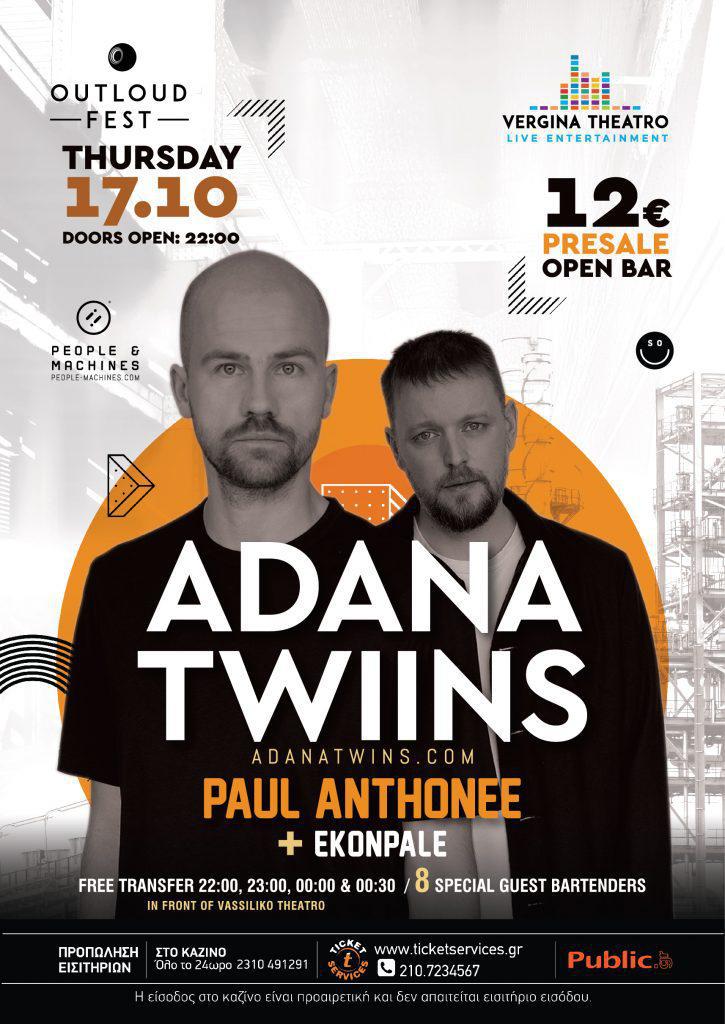Οι Adana Twins αφήνουν για μια νύχτα το Αμβούργο και τα πιο εκρηκτικά live stages ηλεκτρονικής μουσικής στον κόσμο για να έρθουν Θεσσαλονίκη και να “υπογράψουν” με την παρουσία τους το πρώτο dance party της σεζόν στην πόλη, καλεσμένοι του Outloud Fest, την Πέμπτη 17 Οκτωβρίου 2019 στις 22:00 στο Vergina Theatro.