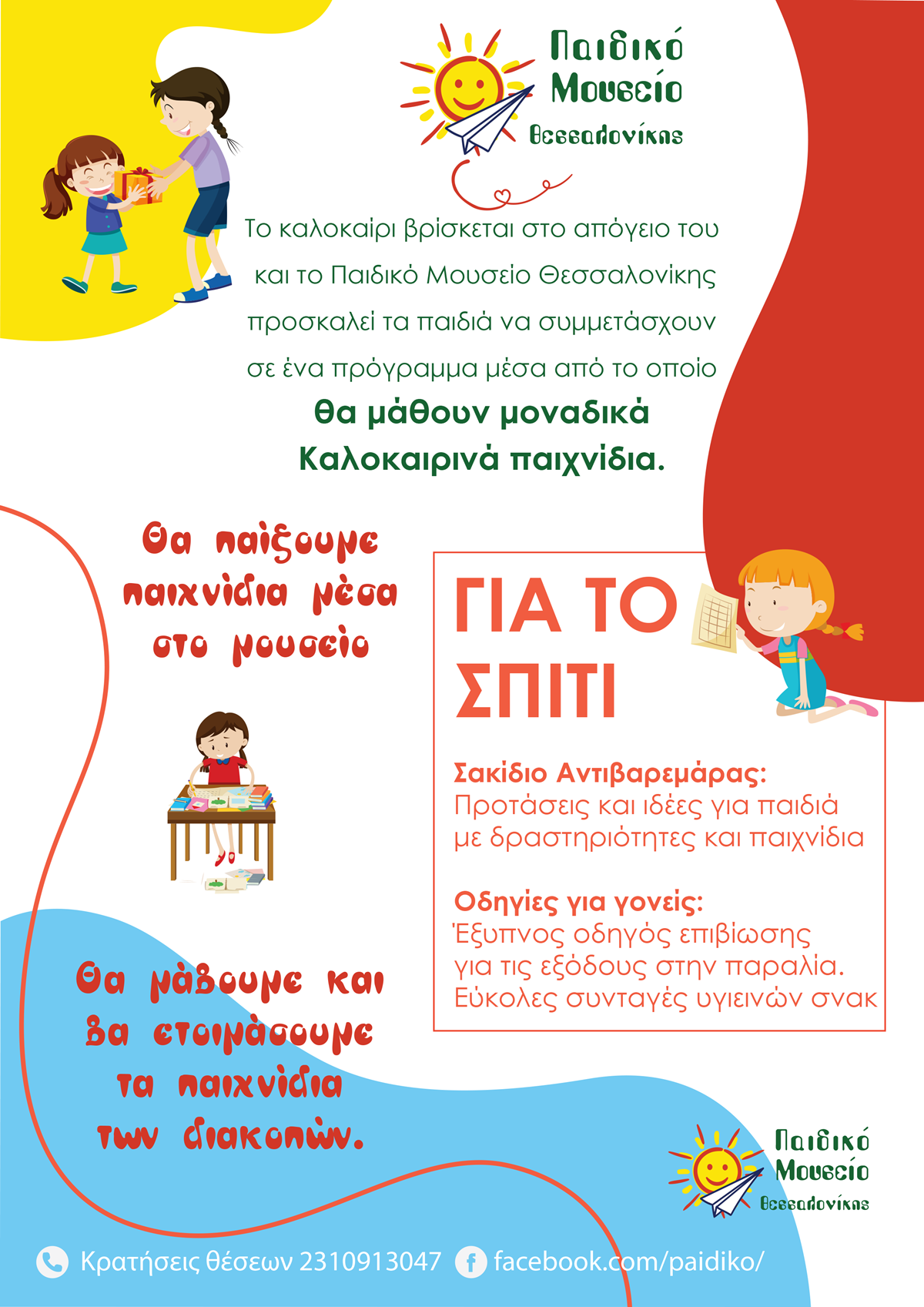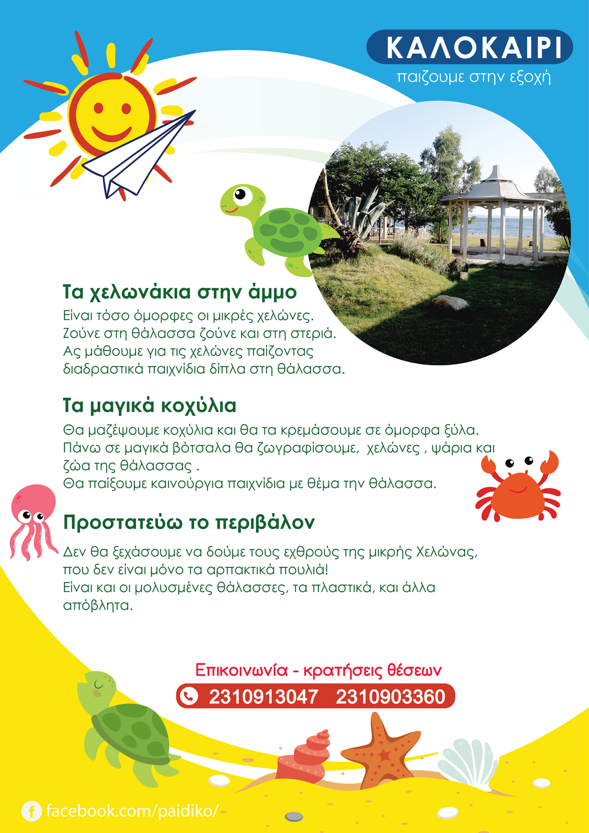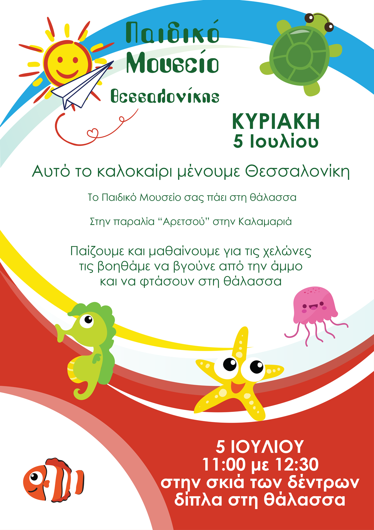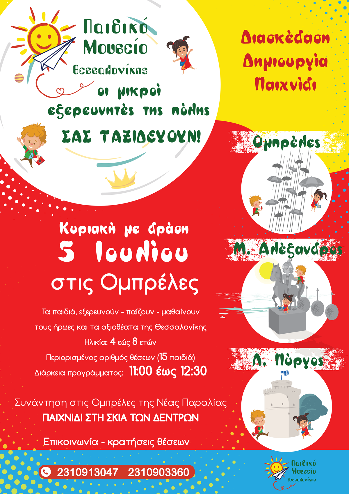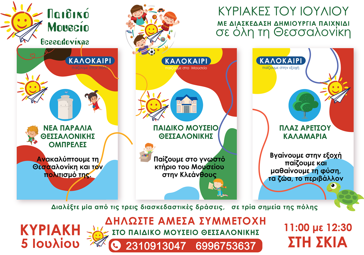 Στις Ομπρέλες του Ζογγολόπουλου, ανακαλύπτουμε την πόλη μας, στην Αρετσού διασκεδάζουμε με τις χελώνες και τα κοχύλια δίπλα στη θάλασσα, στο χώρο του Παιδικού Μουσείου στην Τούμπα (Κλεάνθους 57) παίζουμε τα παιχνίδια του Καλοκαιριού.