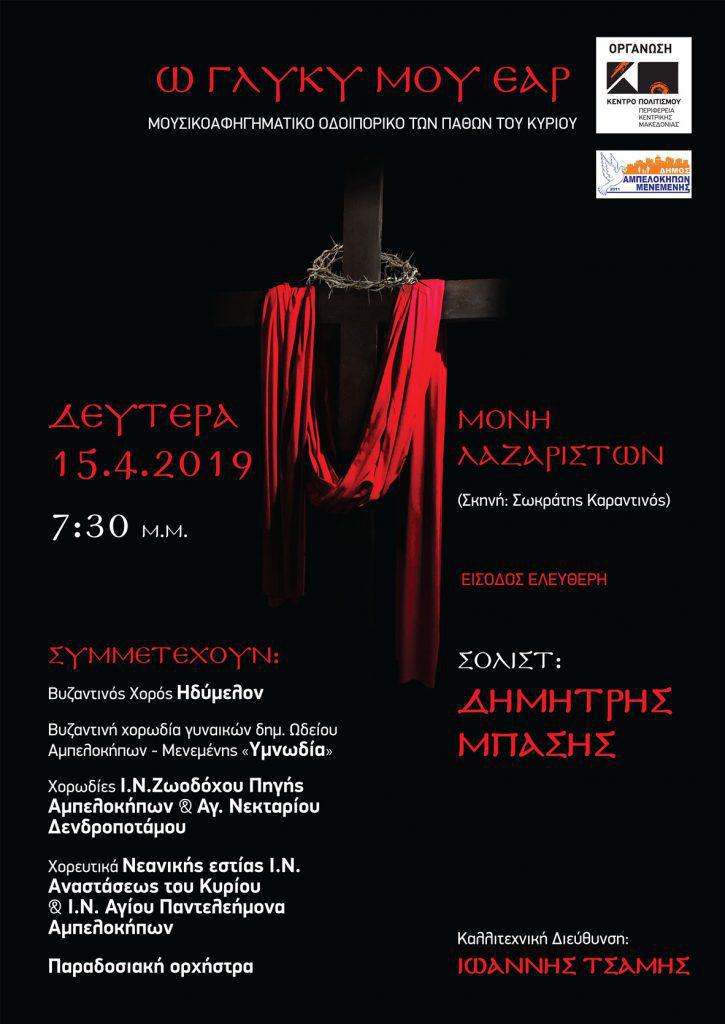 Η Εκδήλωση, που θα φέρει τον τίτλο «Ω ΓΛΥΚΥ ΜΟΥ ΕΑΡ», πλαισιώνει ο βυζαντινός χορός ΗΔΥΜΕΛΟΝ, σε σύμπραξη με τη γυναικεία χορωδία του Δημοτικού Ωδείου Αμπελοκήπων – Μενεμένης ‘’ΥΜΝΩΔΙΑ’’. Οι δυο χορωδίες θα αποδώσουν ύμνους και άσματα των ημερών, υπό την καλλιτεχνική διεύθυνση του Ιωάννη Τσάμη.
