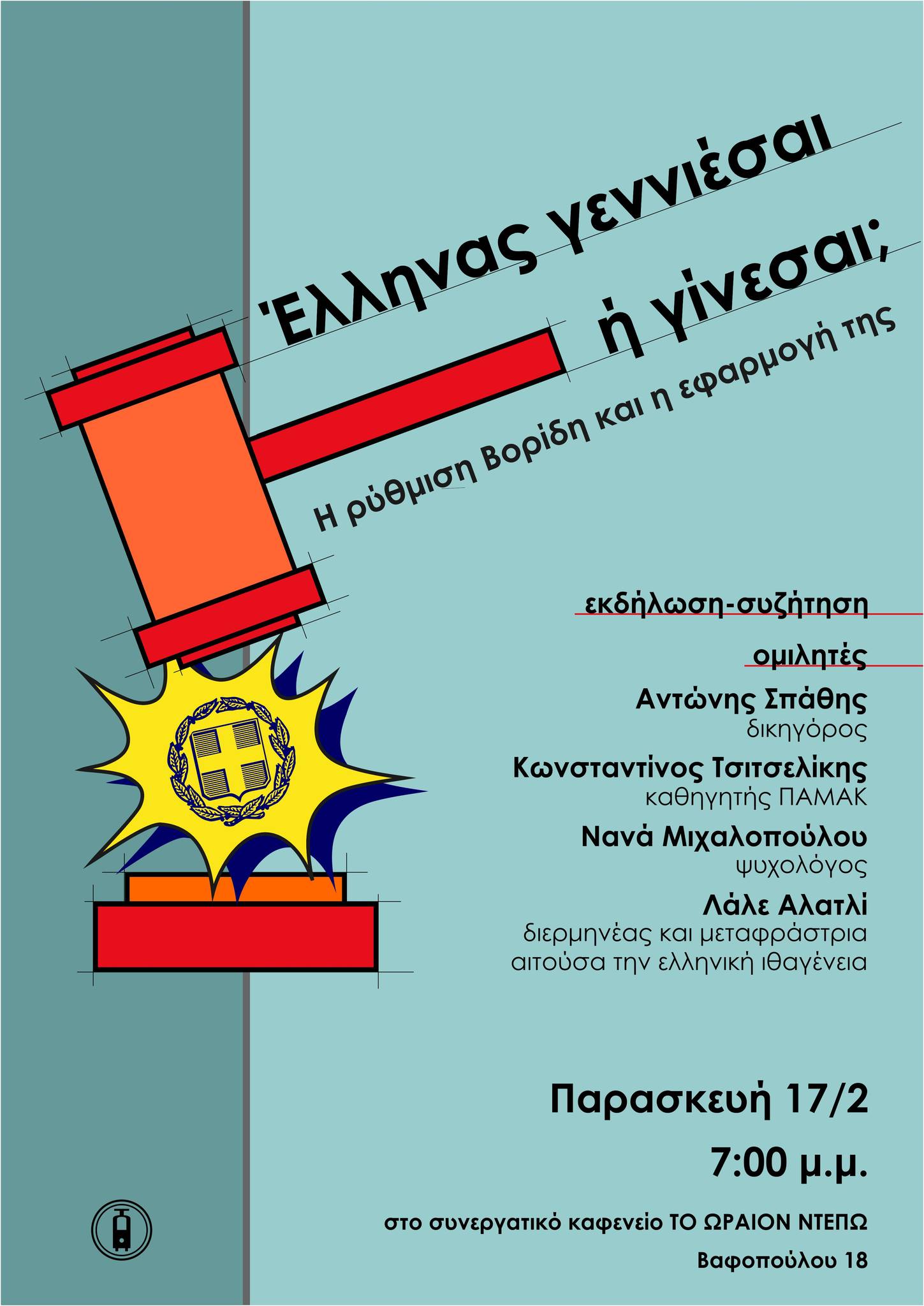 Την Παρασκευή 17 Φεβρουαρίου στις 7μμ στο Συνεργατικό καφενείο «Το Ωραίον Ντεπώ» συζητάμε ανοιχτά τις προκλήσεις και αστοχίες του ελληνικού συστήματος απονομής ιθαγένειας υπό το φως των πρόσφατων μεταρρυθμίσεων στον τομέα της πολιτογράφησης αλλοδαπών και στηρίζουμε τη δικαστική διεκδίκηση της Λάλε για κτήση της ελληνικής ιθαγένειας.