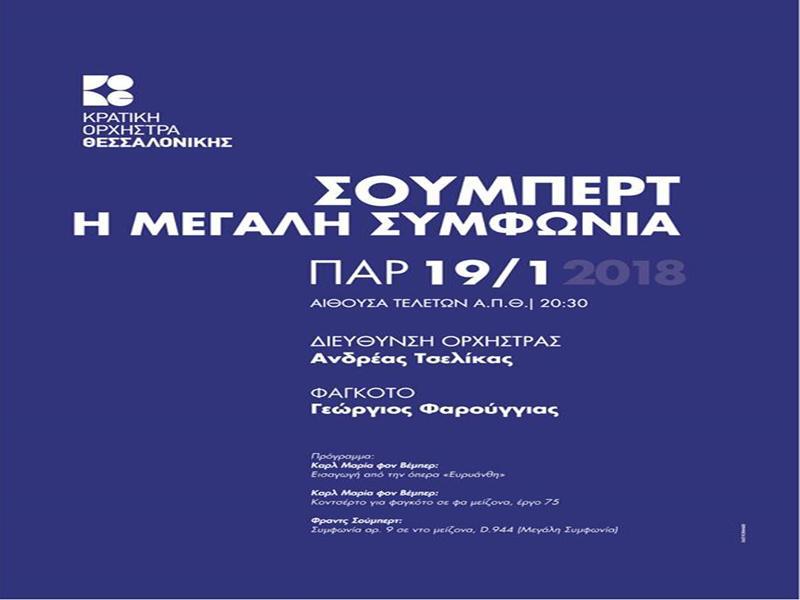Η Κρατική Ορχήστρα Θεσσαλονίκης παρουσιάζει την «Μεγάλη Συμφωνία» του Σούμπερτ, ένα μεγαλειώδες έργο που ο δημιουργός του εμπνεύστηκε από την «Ενάτη» του Μπετόβεν, του συνθέτη που αποτελούσε το ίνδαλμά του και καθόρισε όσο κανείς άλλος τη συνθετική του πορεία. Το έργο αποτελεί πρόκληση για κάθε συμφωνική ορχήστρα λόγω των υψηλών δεξιοτεχνικών του απαιτήσεων και των εξαιρετικά εκτεταμένων μερών και των εγχόρδων και των πνευστών.