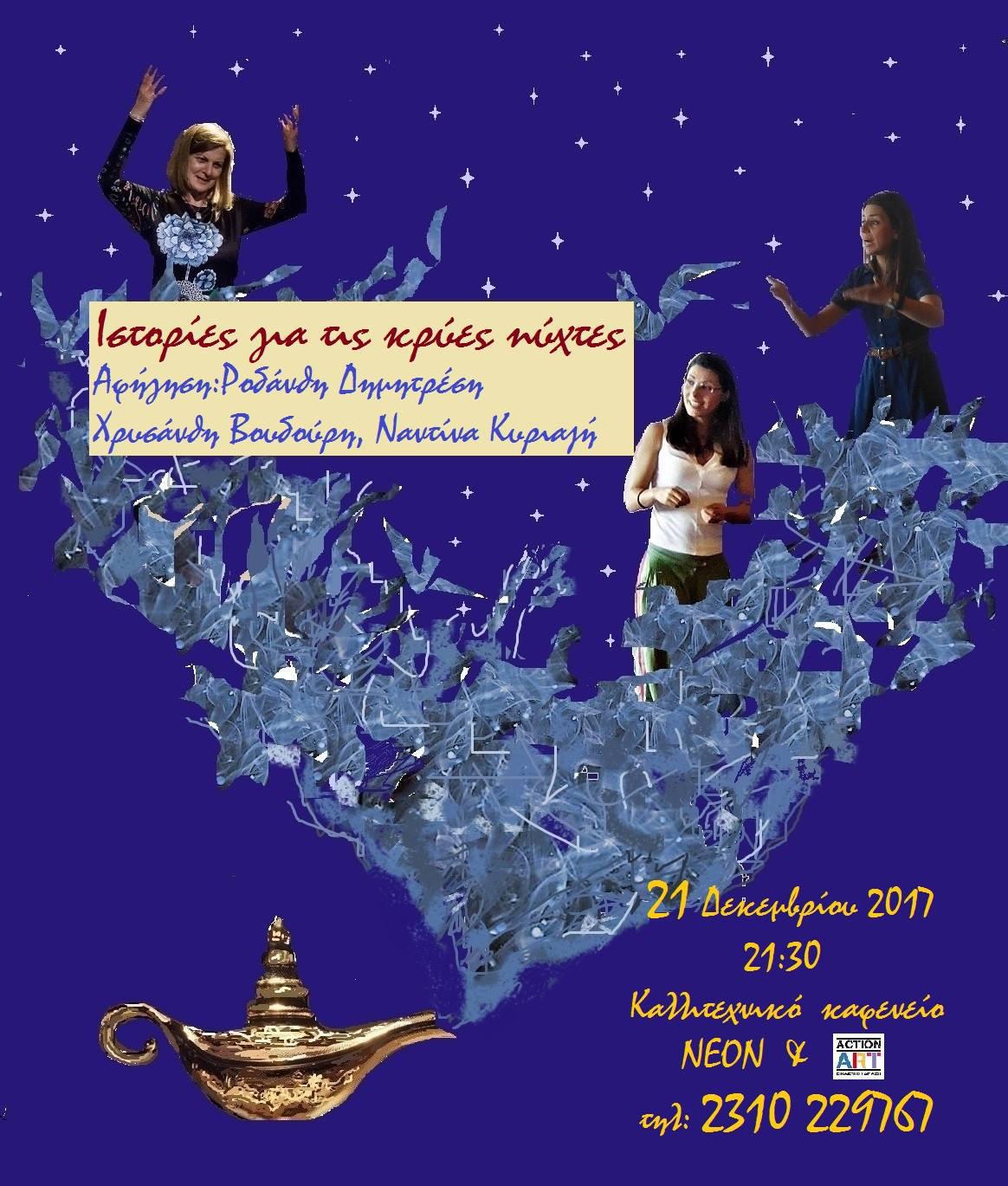 Μια βραδιά γεμάτη ιστορίες και ευχές για τη Νέα Χρονιά! Η Ροδάνθη Δημητρέση , και η Χρυσάνθη Βουδούρη η Ναντίνα Κυριαζή, (ομάδα αφηγητών της Action Art/ Εικαστική Δράση), θα αφηγηθούν ιστορίες της παρέας για τις κρύες νύχτες.