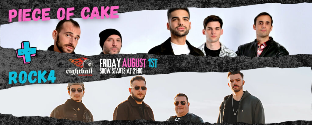 Την Παρασκευή 1 Αυγούστου το Eightball Club υποδέχεται τους Piece of Cake και Rock4, σε ένα καλοκαιρινό live που υπόσχεται να ξυπνήσει δυνατές μουσικές αναμνήσεις και να σας παρασύρει σε ένα ξέφρενο πάρτι υπό τους ήχους παλιών και νέων επιτυχιών !!