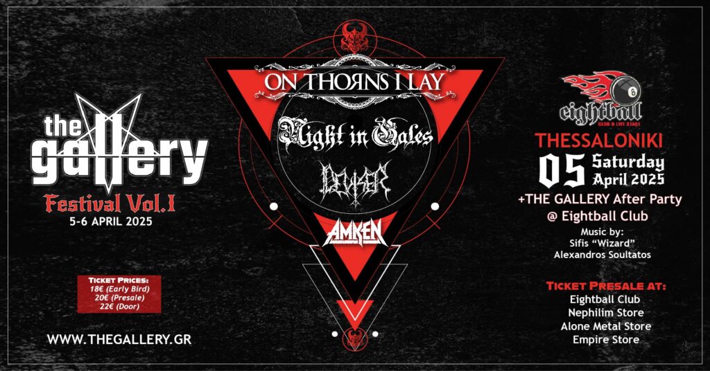Είμαστε στην ευχάριστη θέση να σας ανακοινώσουμε το πρώτο φεστιβάλ του metal web portal THE GALLERY, το οποίο θα πραγματοποιηθεί το Σάββατο, 5 Απριλίου 2025 στη Θεσσαλονίκη! AMKEN, DEVISER, NIGHT IN GALES και ON THORNS I LAY είναι η τετράδα-φωτιά που θα εμφανιστεί στη σκηνή του Eightball Club (Πίνδου 1, Λαδάδικα)!