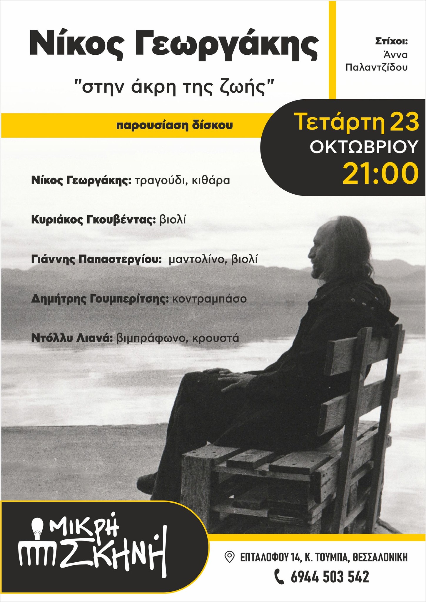 Παρουσίαση δίσκου του Θεσσαλονικιού κιθαρίστα και συνθέτη Νίκου Γεωργάκη, με τίτλο “Στην άκρη της ζωής” θα γίνει την Τετάρτη 23 Οκτωβρίου 2024, στον ατμοσφαιρικό χώρο της “Μικρής Σκηνής”, στην Κ. Τούμπα Θεσσαλονίκης.