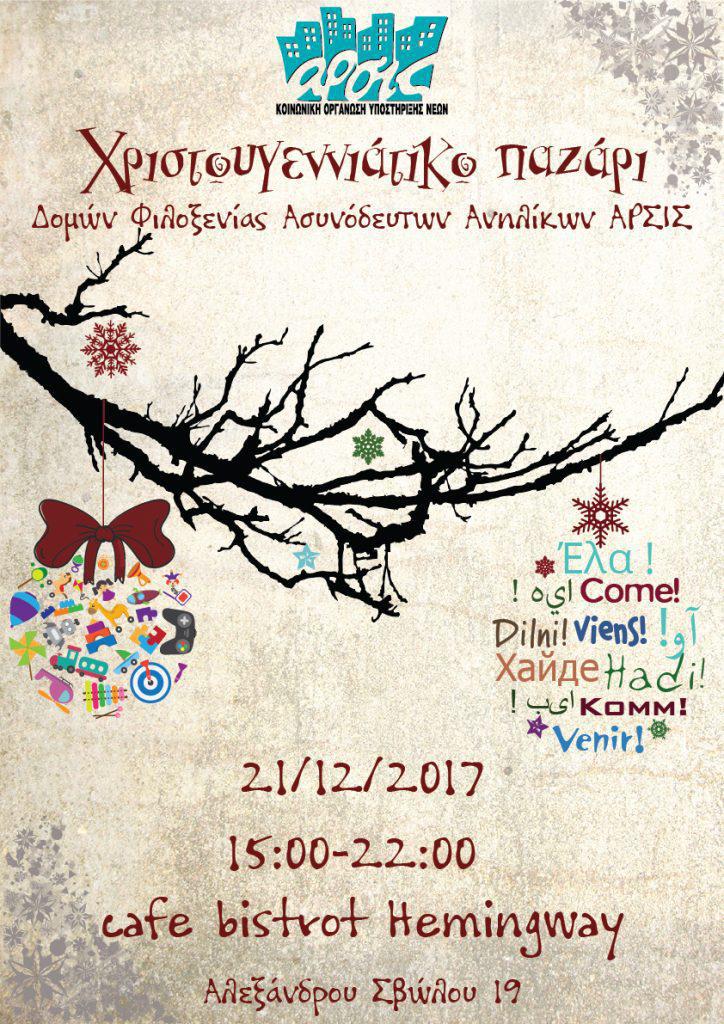 Οι Δομές Φιλοξενίας Ασυνόδευτων Ανηλίκων της ΑΡΣΙΣ – Κοινωνική Οργάνωση Υποστήριξης Νέων διοργανώνουν «Χριστουγεννιάτικο Bazaar» την Πέμπτη 21/12/2017, από τις 15:00 έως τις 22:00, στο cafe bistrot Hemingway (Αλεξάνδρου Σβώλου 19, Θεσσαλονίκη).