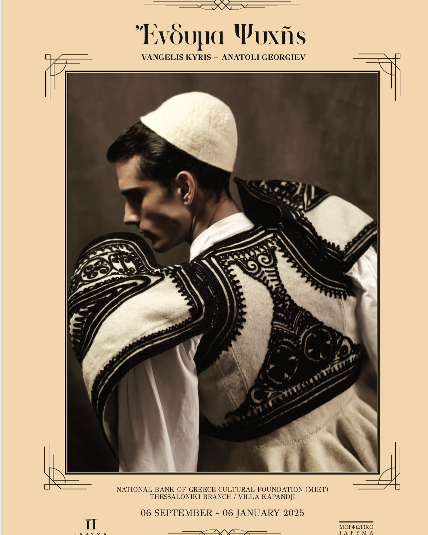 Πρόκειται για μια έκθεση μοναδική, όπου ο φωτογράφος Βαγγέλης Κύρης και ο εκφραστής της κεντητικής τέχνης Ανατόλι Γεωργίεφ παρουσιάζουν το «ελληνικό ένδυμα» με έναν ιδιαίτερο τρόπο και μια καλλιτεχνική οπτική, φορεμένο από σύγχρονους ανθρώπους, και μέσα από την ώσμωση της φωτογραφίας με το ύφασμα και την κεντητική τέχνη.