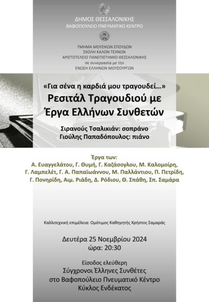 Στο πλαίσιο του 11ου Κύκλου Συναυλιών “Σύγχρονοι Έλληνες Συνθέτες στο Βαφοπούλειο Πνευματικό Κέντρο”.