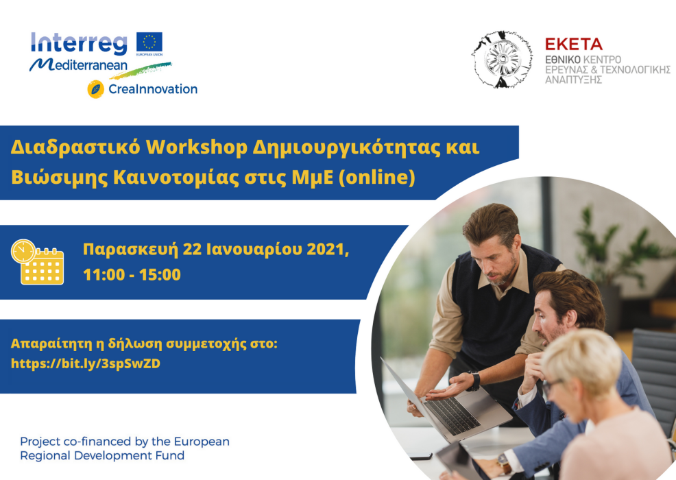 Το Εθνικό Κέντρο Έρευνας και Τεχνολογικής Ανάπτυξης (ΕΚΕΤΑ), στο πλαίσιο του ερευνητικού έργου «Δημιουργία βιώσιμης καινοτομίας στις Μικρομεσαίες Επιχειρήσεις με τη χρήση δημιουργικών μεθόδων και διαδικασιών» (“Create sustainable Innovation in SMEs using creative methods and processes”) και ακρωνύμιο “CreaInnovation”, διοργανώνει την Παρασκευή 22 Ιανουαρίου 2021 και ώρες 11:00 – 15:00 Διαδραστικό Workshop Δημιουργικότητας και Βιώσιμης Καινοτομίας στις Μικρομεσαίες Επιχειρήσεις το οποίο θα πραγματοποιηθεί μέσω τηλεδιάσκεψης.