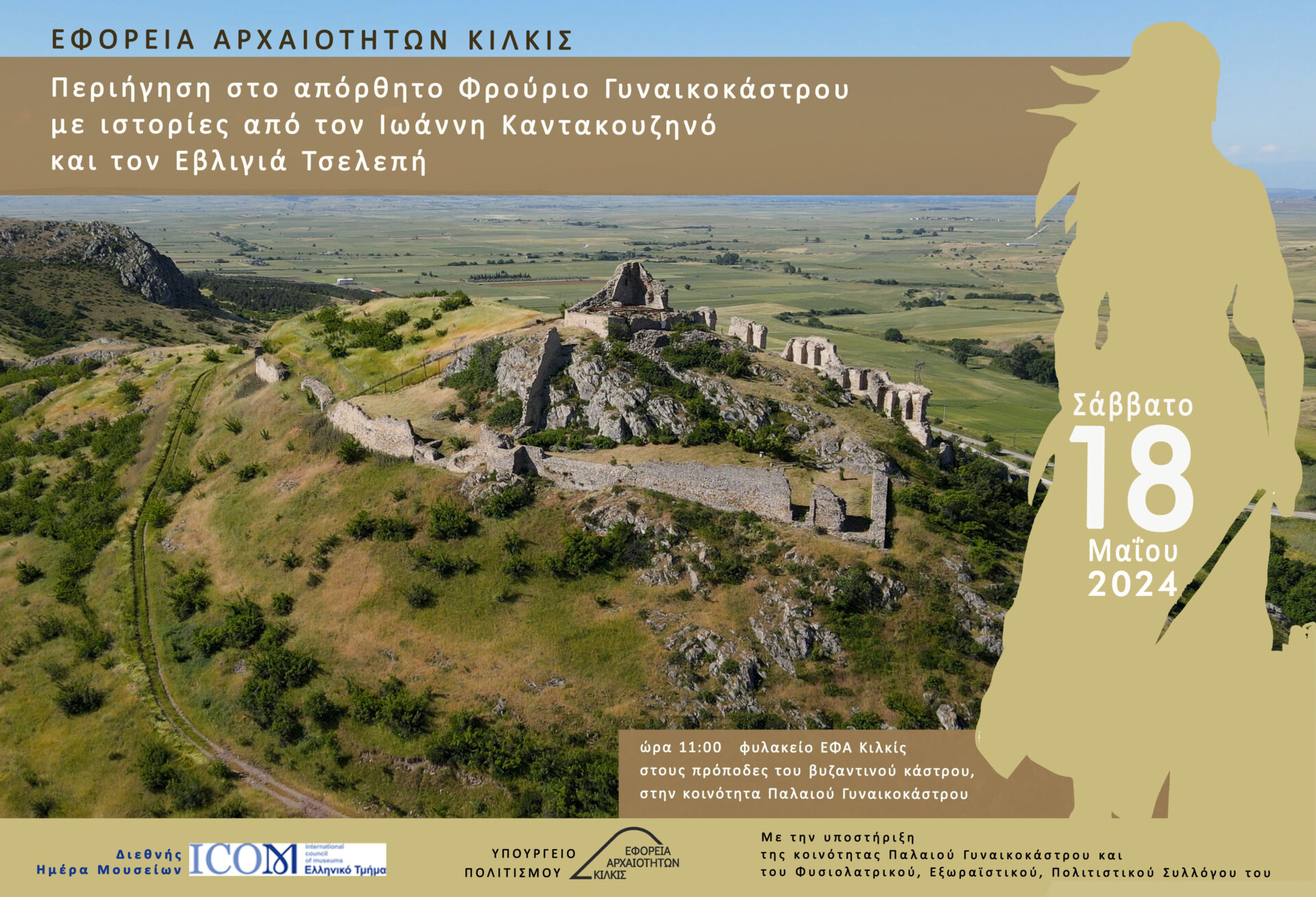 Σάββατο, 18 Μαΐου 2024, ώρα 11.00 Περιήγηση στο απόρθητο Φρούριο Γυναικοκάστρου, με ιστορίες από τον Ιωάννη Καντακουζηνό και τον Εβλιγιά Τσελεπή Το Γυναικόκαστρο είχε την αγαθή τύχη να περιγραφεί, λεπτομερώς από τον λόγιο αυτοκράτορα και ιστορικό Ιωάννη Καντακουζηνό (μέσα 14ου αι.), αλλά και από Τούρκους περιηγητές, όπως ο Εβλιγιά Τσελεμπή (μέσα 17ου αι.). Με αναφορές στη στρατηγική του σημασία, στα τείχη και τα κτήριά του, στη μυθιστορηματική Μαρουλία και στους ανθρώπους του μεταβυζαντινού οικισμού του, συμπληρωμένες από τις πληροφορίες που προσφέρουν οι κατά καιρούς ανασκαφικές και αναστηλωτικές εργασίες, θα περιηγηθούμε στους χώρους του απόρθητου βυζαντινού φρουρίου του Γυναικοκάστρου, που αποτέλεσε σημαντικό φυλάκιο για τη βόρεια άμυνα της συμβασιλεύουσας Θεσσαλονίκης.