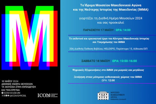 Το Ίδρυμα Μουσείου Μακεδονικού Αγώνα και της Νεότερης Ιστορίας της Μακεδονίας (ΙΜΜΑ) συμμετέχει στους εορτασμούς της Διεθνούς Ημέρας Μουσείων 2024 με δράσεις για μικρούς και μεγάλους, ξεναγήσεις, διευρυμένο ωράριο λειτουργίας και ελεύθερη είσοδο το Σάββατο 18 Μαΐου.