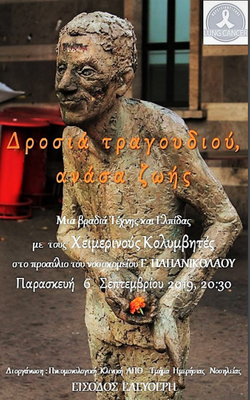 Στα πλαίσια των θετικών αυτών εξελίξεων σχετικά με τη συγκεκριμένη νόσο, η Πνευμονολογική Κλινική του ΑΠΘ και το Τμήμα Ημερήσιας Νοσηλείας θα πραγματοποιήσουν μια μουσική βραδιά στον προαύλιο χώρο του ΓΝΘ “Γ. ΠΑΠΑΝΙΚΟΛΑΟΥ” (εγκαταλελειμμένη πτέρυγα – χώρος εκδηλώσεων στο Πέτρινο Κτίριο) με το συγκρότημα των “Χειμερινών Κολυμβητών” για τις 6 Σεπτεμβρίου 2019 και ώρα 20.30. Στην εκδήλωση θα μιλήσουν επίσης γιατροί (κατά το δυνατόν συνοπτικότερα και με λόγο μη τεχνοκρατικό), ασθενείς με καρκίνο του πνεύμονα σχετικά με τον τρόπο που βίωσαν τη νόσο από τη διάγνωση μέχρι και τη θεραπεία ενώ θα υπάρξει και εμβόλιμη απαγγελία ποιημάτων.