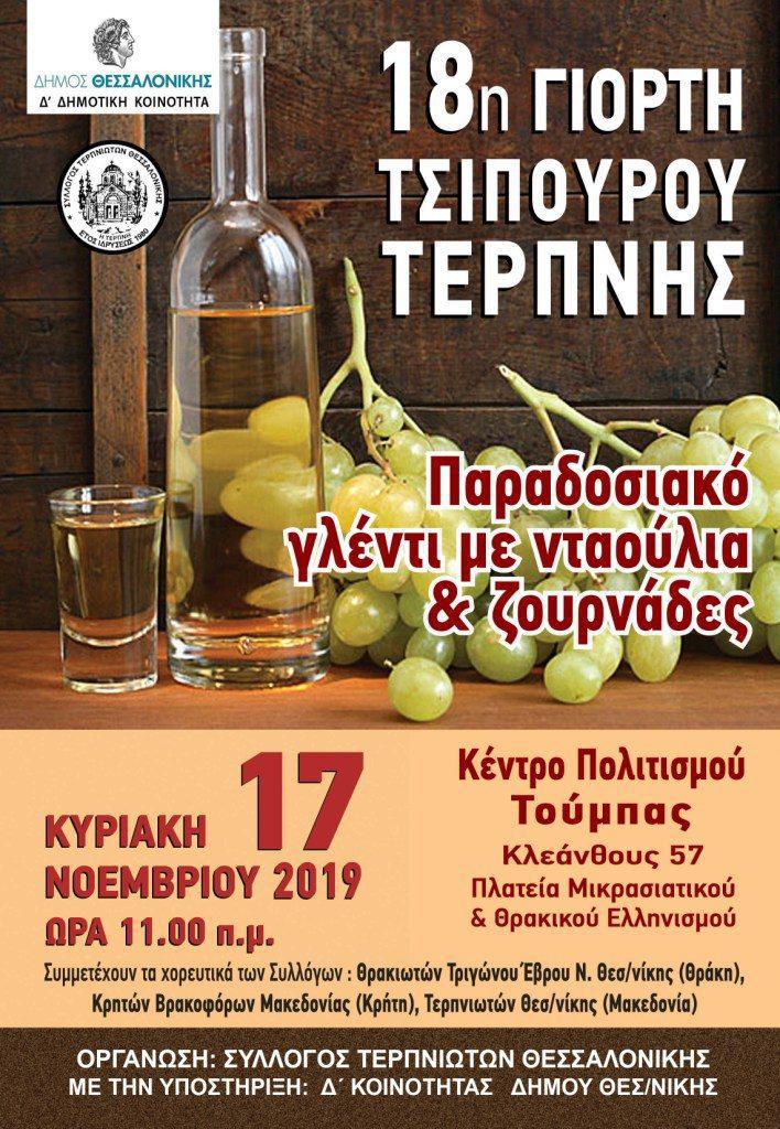 Η καθιερωμένη πλέον “ΓΙΟΡΤΗ ΤΣΙΠΟΥΡΟΥ ΤΕΡΠΝΗΣ” που πραγματοποιείται για 18η συνεχή χρονιά επιστρέφει την Κυριακή 17 Νοεμβρίου 2018 από τις 11 το πρωί στο χώρο μπροστά από το Κέντρο Πολιτισμού Τούμπας Κλεάνθους 57, (Πλατεία Μικρασιατικού & Θρακικού Ελληνισμού).