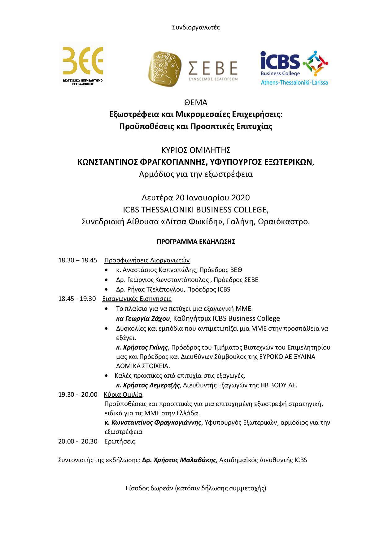 Το Βιοτεχνικό Επιμελητήριο Θεσσαλονίκης, ο Σύνδεσμος Εξαγωγέων Βορείου Ελλάδος – ΣΕΒΕ και το ICBS Business College διοργανώνουν τη Δευτέρα 20 Ιανουαρίου 2020 και ώρα 18:30, στη συνεδριακή αίθουσα «Λίτσα Φωκίδη» του ICBS Thessaloniki Business College, Γαλήνη Ωραιοκάστρου, εκδήλωση με Θέμα: Εξωστρέφεια και Μικρομεσαίες Επιχειρήσεις: Προϋποθέσεις και Προοπτικές Επιτυχίας.