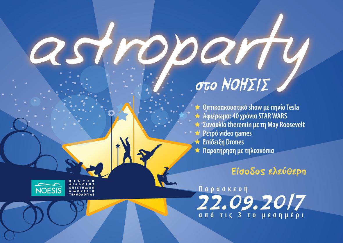 Το ΝΟΗΣΙΣ σας καλεί στο φετινό Astroparty, μια μέρα ανοιχτή για το κοινό, με ελεύθερη είσοδο και ποικιλία δραστηριοτήτων από το χώρο της επιστήμης και της τεχνολογίας για όλες τις ηλικίες. Μια ευκαιρία να γνωρίστε το ΝΟΗΣΙΣ, έναν πολυχώρο άτυπης εκπαίδευσης, όπου η επιστήμη συνδυάζεται με τη βιωματική εμπειρία και η γνώση με την ψυχαγωγία.