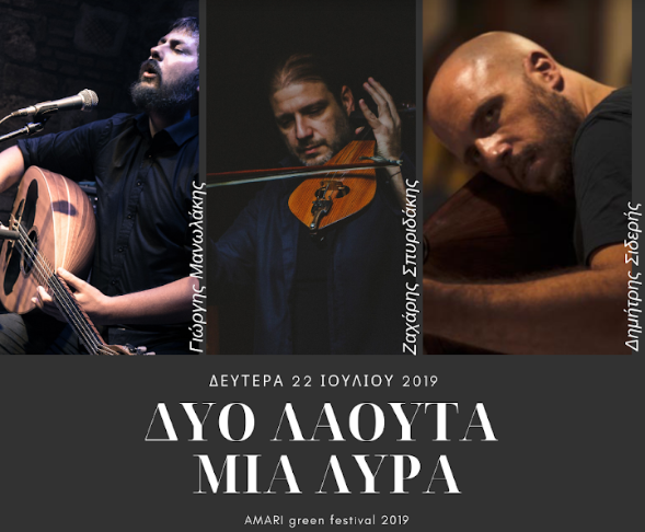 22:30 – 00:00 Σχ. Ασωμάτων/Κτήμα Πάνακρον: Συναυλία: «Δυο Λαούτα, Μια Λύρα», με τους Γιώργο Μανωλάκη, Δημήτρη Σιδερή και Ζαχάρη Σπυριδάκη.