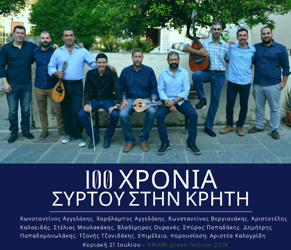 22:00 – 00:00 Σχ. Ασωμάτων/Κτήμα Πάνακρον: Συναυλία «100 χρόνια Συρτού στην Κρήτη». Παίζουν και τραγουδούν: Κωνσταντίνος Αγγελάκης, Χαράλαμπος Αγγελάκης, Κωνσταντίνος Βεργιανάκης, Αριστοτέλης Καλοειδάς, Στέλιος Μουλακάκης, Βλαδίμηρος Ουρανός, Σπύρος Παπαδάκης, Δημήτρης Παπαδομανωλάκης, Τζανής Τζανιδάκης. Επιμέλεια – παρουσίαση: Αριστέα Καλογρίδη. Χορεύουν οι χορευτικές ομάδες του Αμαρίου.