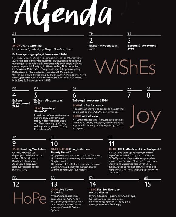 Έλληνες δημιουργοί, εικαστικές παρεμβάσεις, εκθέσεις φωτογραφίας, παρουσιάσεις, fashion & beauty workshops, συνθέτουν το πιο πολυμορφικό σκηνικό. Μαθήματα γευσιγνωσίας, masterclasses, life coaching, opening & closing parties προκαλούν την ενεργή συμμετοχή του κοινού στην πιο μοντέρνα, γοητευτική και δυναμική πρόταση της δημιουργικής Θεσσαλονίκης. Οι σελίδες του περιοδικού GLOW ζωντανεύουν και υποδέχονται το κοινό σε μια live εκδοχή της καθημερινότητας, με πρόσωπα, τάσεις, τέχνη, μόδα και ομορφιά να κυριαρχούν στον νέο διαδραστικό χώρο της πόλης, υπό την αιγίδα του Δήμου Θεσσαλονίκης και του Εμπορικού Συλλόγου Θεσσαλονίκης και με αποκλειστικό στόχο την οικονομική ενίσχυση της «Μέλισσας».
