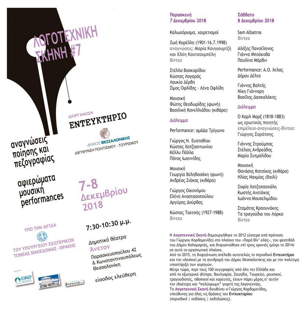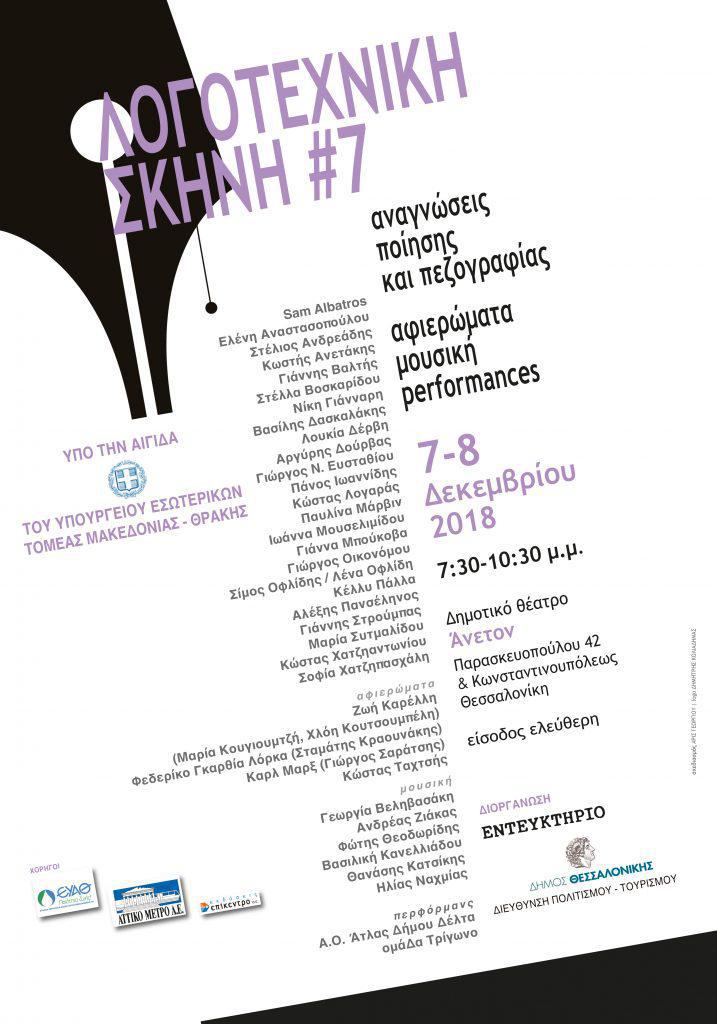 Είκοσι τέσσερις καταξιωμένοι, νεότεροι αλλά και πρωτοεμφανιζόμενοι ποιητές και πεζογράφοι από τη Θεσσαλονίκη, από την Αθήνα και από άλλες πόλεις, καθώς και από την Κύπρο, και μαζί τους μουσικοί και ερμηνευτές, σκηνοθέτες/χορογράφοι, και ηθοποιοί/χορευτές συμμετέχουν στη φετινή Λογοτεχνική Σκηνή #7, που θα πραγματοποιηθεί στο θέατρο «Άνετον» (Παρασκευοπούλου 42 και Κωνσταντινουπόλεως), στις 7 και 8 Δεκεμβρίου (έναρξη 19.30 ακριβώς), με ελεύθερη είσοδο.