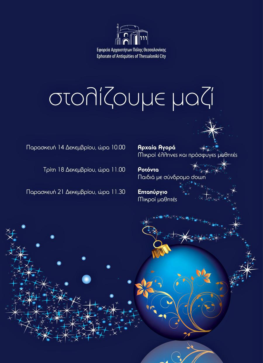Πιο συγκεκριμένα η Εφορεία Αρχαιοτήτων Πόλης Θεσσαλονίκης, αποφάσισε φέτος τα Χριστούγεννα να κάνει κάτι διαφορετικό. Να στολίσει τα χριστουγεννιάτικα δέντρα της στην Αρχαία Αγορά, στη Ροτόντα και στο Επταπύργιο, με μαθητές δημοτικού, προσφυγόπουλα και παιδιά με σύνδρομο down! Όλα αυτά, με την συνοδεία μουσικής, τραγουδιών, αλλά και κεράσματα!