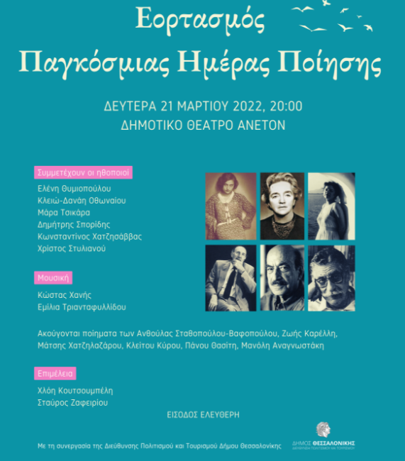 Η Εταιρεία Συγγραφέων και η Εταιρεία Λογοτεχνών Θεσσαλονίκης, με τη συνεργασία της Διεύθυνσης Πολιτισμού και Τουρισμού Δήμου Θεσσαλονίκης, διοργανώνουν εκδήλωση για την Παγκόσμια Ημέρας Ποίησης τη Δευτέρα 21 Μαρτίου 2022 (εαρινή ισημερία) και ώρα 20:00, στο Θέατρο «Άνετον» (Παρασκευοπούλου 42).