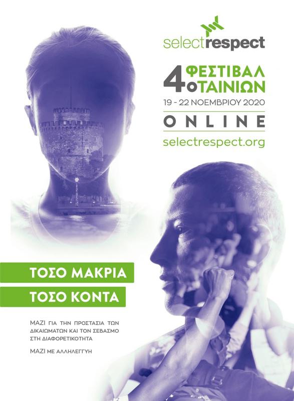 Για τέταρτη φορά το Φεστιβάλ Ταινιών Select Respect έρχεται στη Θεσσαλονίκη, με θεματική τα ανθρώπινα δικαιώματα, ταινίες μυθοπλασίας και ντοκιμαντέρ αλλά και μια ταινία έκπληξή από τον σπουδαίο Έλληνα σκηνοθέτη Γιώργου Λάνθιμου, αυτή τη φορά διαδικτυακά στο www.selectrespect.org από τις 19 έως και τις 22 Νοεμβρίου 2020.