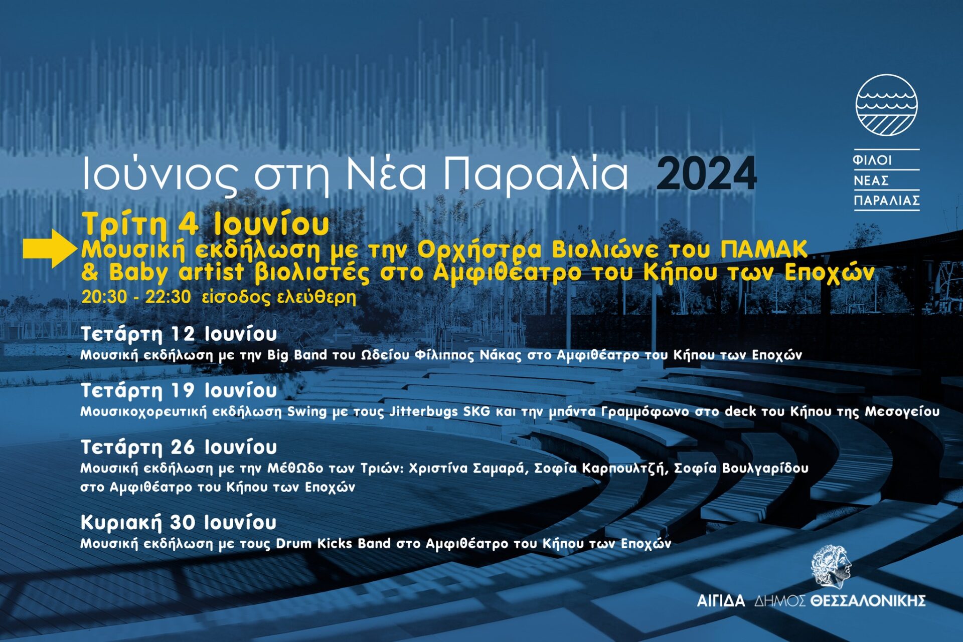 Οι εκδηλώσεις “Ιούνιος στη Νέα Παραλία” ξεκινούν την Τρίτη 4 Ιουνίου στο Αμφιθέατρο του Κήπου των εποχών, με μια υπέροχη μουσική βραδιά με την Ορχήστρα Βιολιώνε και τους Baby Artist βιολιστές, με ελεύθερη είσοδο.