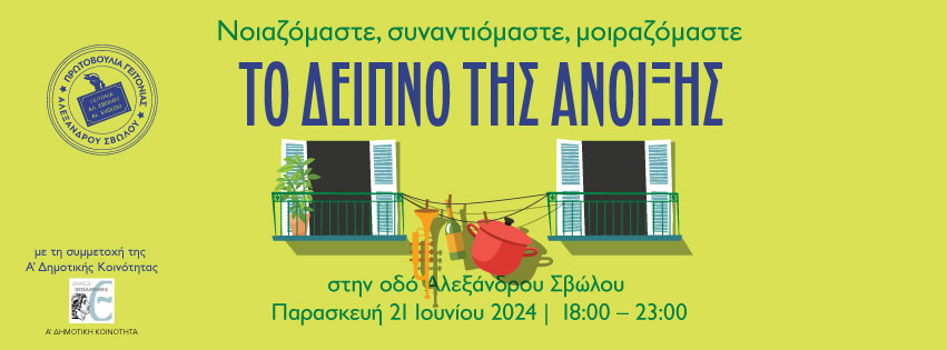 Τον Ιούνιο επιστρέφει στη γειτονιά της Αλεξάνδρου Σβώλου το «Δείπνο της Άνοιξης». Η πρωτοβουλία «Η Γειτονιά της Αλεξάνδρου Σβώλου», ανακοίνωσε ότι το «Δείπνο» θα γίνει στις 21 Ιουνίου από τις 18:00 έως τις 23:00. Σύντομα θα ανακοινωθούν περισσότερες λεπτομέρειες για το φετινό Δείπνο της Άνοιξης.