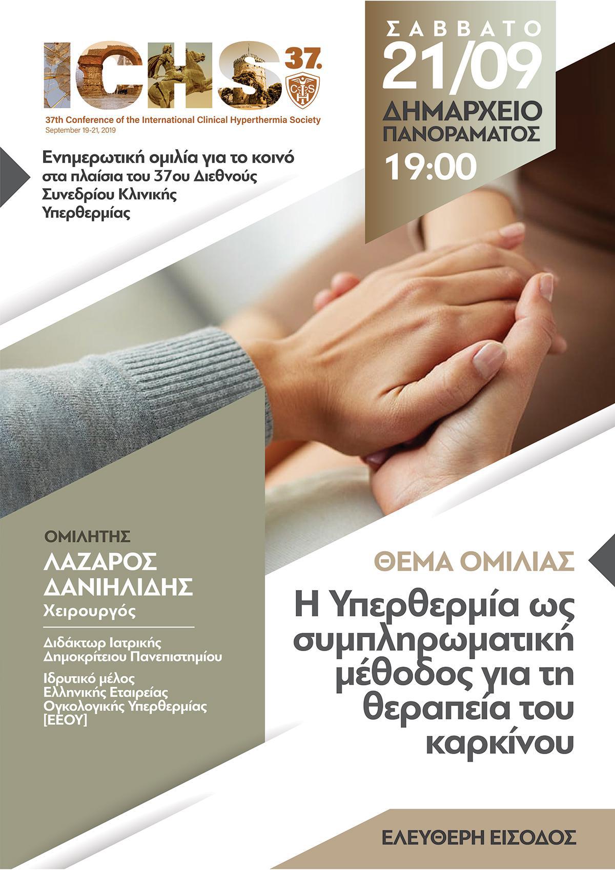 Στο πλαίσιο του 37ου συνεδρίου της Διεθνούς Εταιρείας Κλινικής Υπερθερμίας (International Clinical Hyperthermia Society) ο πρόεδρος της Οργανωτικής Επιτροπής του συνεδρίου, χειρουργός, Διδάκτωρ και ιδρυτικό μέλος της Ελληνικής Εταιρείας Ογκολογικής Υπερθερμίας, Λάζαρος Δανιηλίδης θα μιλήσει το Σάββατο 21 Σεπτεμβρίου στις 19.00 το απόγευμα σε ειδική εκδήλωση στο αμφιθέατρο «Σταύρος Κουγιουμτζής» με θέμα «Η Υπερθερμία ως συμπληρωματική μέθοδος για τη θεραπεία του καρκίνου». Η εκδήλωση που θα είναι ελεύθερη για το κοινό, έχει ενημερωτικό χαρακτήρα με σκοπό να επικοινωνήσει και να κάνει γνωστά τα αποτελέσματα και τα συμπεράσματα του διεθνούς συνεδρίου σε όλους τους πολίτες.
