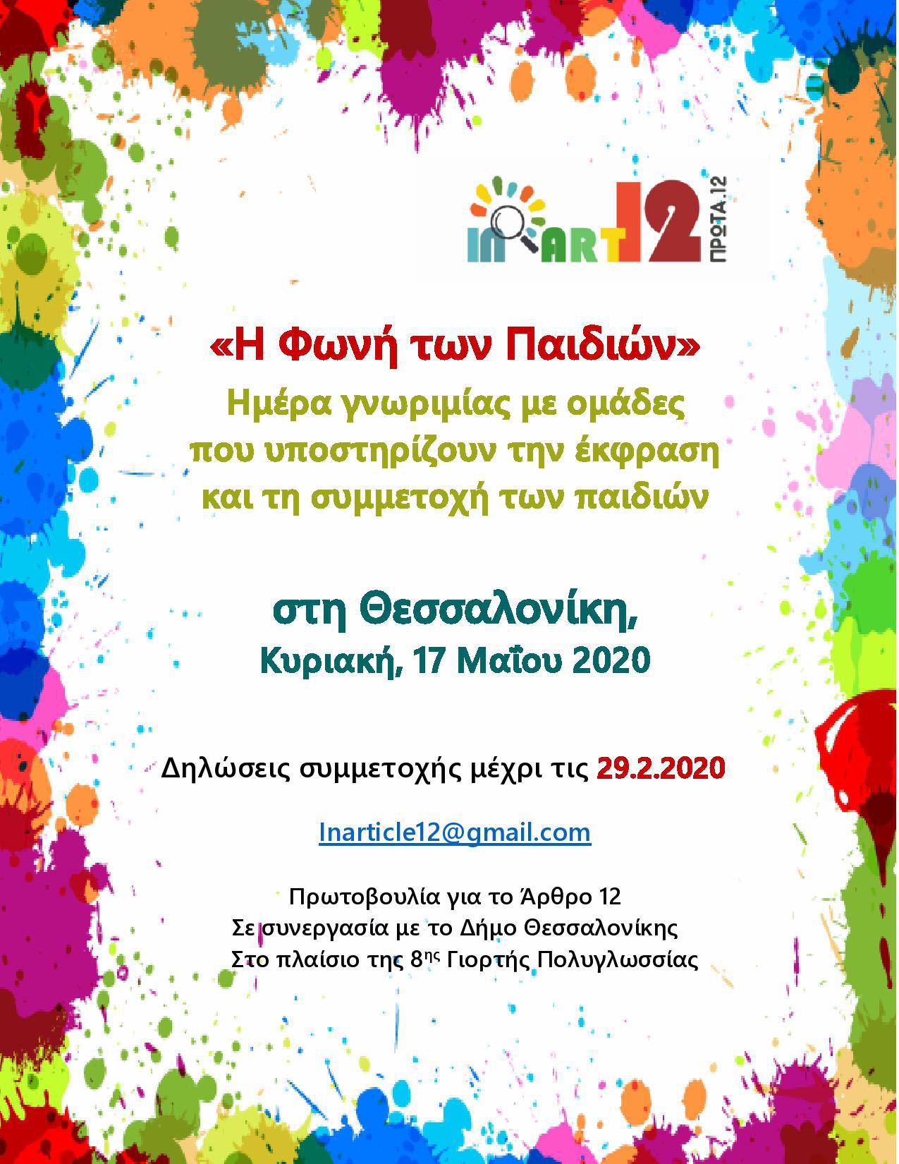Η Πρωτοβουλία για το Άρθρο 12, σε συνεργασία με τον Δήμο Θεσσαλονίκης, στο πλαίσιο της 8ης Γιορτής Πολυγλωσσίας, διοργανώνει τη “Φωνή των Παιδιών“, μια Ημέρα Γνωριμίας με ομάδες που υποστηρίζουν την έκφραση και τη συμμετοχή των παιδιών, την Κυριακή 17 Μαίου 2020, στη Θεσσαλονίκη, στο Κέντρο Δια Βίου Μάθησης, στην οδό Εγνατίας 132.