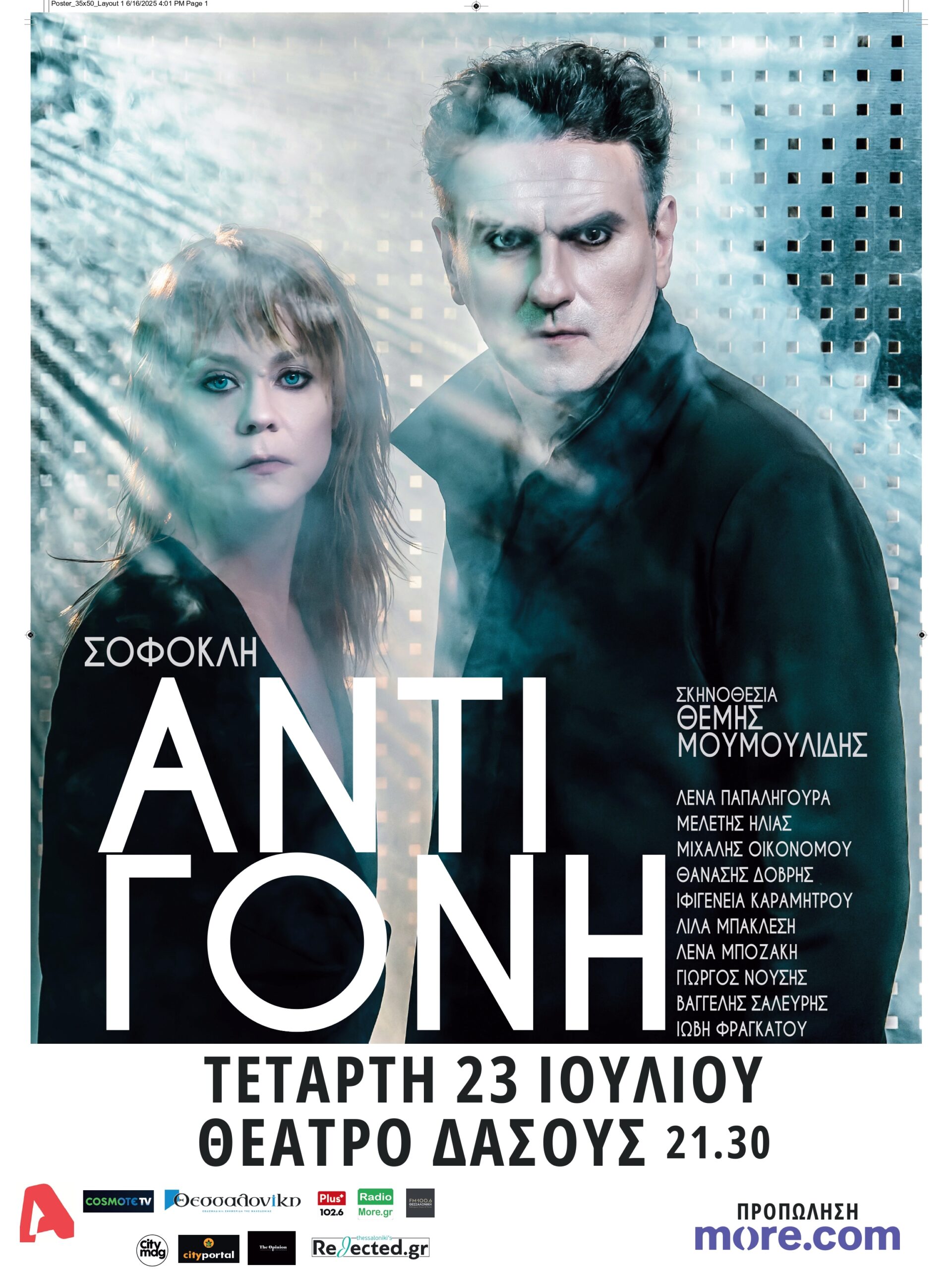 O Θέμης Μουμουλίδης επιστρέφει για τρίτη φορά στην Αντιγόνη, την κορυφαία τραγωδία του Σοφοκλή, και σε μια από τις συναρπαστικότερες ηρωίδες στην ιστορία της δυτικής δραματουργίας. Μαζί του ένα σύνολο εξαιρετικών ηθοποιών με την Λένα Παπαληγούρα στον ρόλο της Αντιγόνης και τον Μελέτη Ηλία στον ρόλο του Κρέοντα.