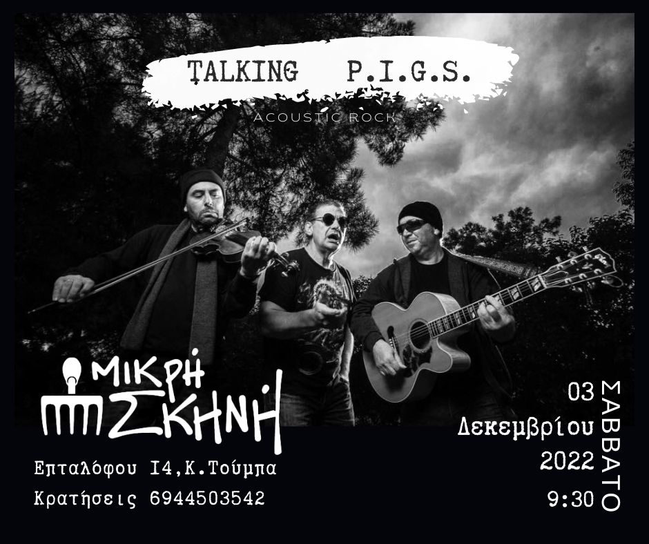 Η “Μικρή Σκηνή”, η νέα μουσική σκηνή στην Κ. Τούμπα, Επταλόφου 14, που αγαπήθηκε από τον κόσμο ήδη από την πρώτη περίοδο λειτουργίας της, παρουσιάζει το Σάββατο 3 Δεκεμβρίου 2022 την acoustic rock band “Talking P.I.G.S”.