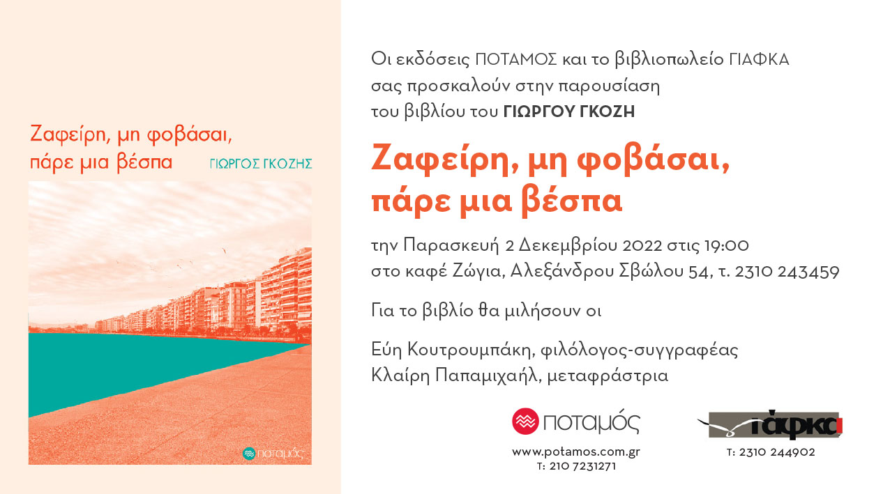 Την Παρασκευή 2 Δεκεμβρίου η Ζώγια υποδέχεται τον Γιώργο Γκόζη με το βιβλίο του «Ζαφείρη μη φοβάσαι, πάρε μια βέσπα». Παραμυθητικό παράκουσμα αφηγήσεων και διηγήσεων «Γεννήθηκα στη Θεσσαλονίκη τον περασμένο αιώνα και καθώς την κουβαλάω αιωνίως μέσα μου, πάντοτε σε αυτήν επιστρέφω.»