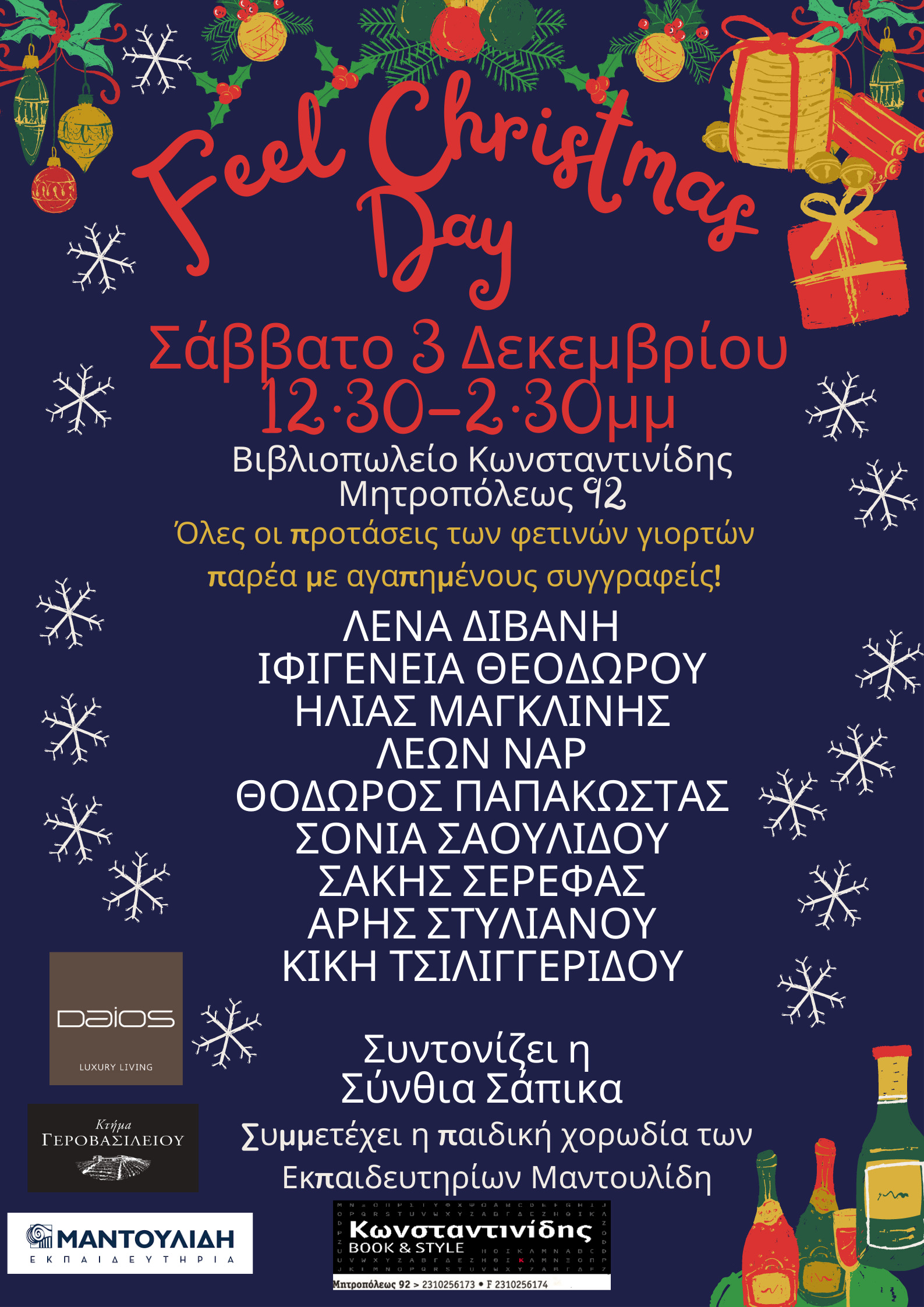 Για μια ακόμη χρονιά το βιβλιοπωλείο Κωνσταντινίδης διοργανώνει το Χριστουγεννιάτικο Γεγονός του Βιβλίου «Feel Christmas Day» Κάθε χρόνο συγγραφείς συναντώνται με τους φίλους του βιβλίου, την ίδια μέρα, την ίδια ώρα, στο ίδιο μέρος, σε ατμόσφαιρα χριστουγεννιάτικη, χωμένοι στα βιβλία… στο μεγαλύτερο χριστουγεννιάτικο book event στη Θεσσαλονίκη!