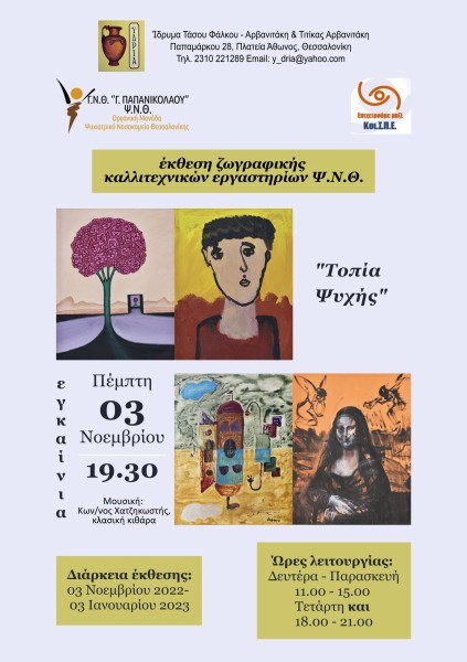 Το Ίδρυμα Πολιτισμού «Υδρία» Τάσου Φάλκου – Αρβανιτάκη και Τιτίκας Αρβανιτάκη, σε συνεργασία με το Ψυχιατρικό Νοσοκομείο Θεσσαλονίκης (Γ.Ν.Θ. Γ. ΠΑΠΑΝΙΚΟΛΑΟΥ) και τον Κοινωνικό Συνεταιρισμό Περιορισμένης Ευθύνης (Κοι.Σ.Π.Ε.) Δυτικού Τομέα Ψυχικής Υγείας της Περιφερειακής Αυτοδιοίκησης Θεσσαλονίκης σας προσκαλούν στα εγκαίνια της έκθεσης ζωγραφικής με τίτλο «Τοπία Ψυχής», την Πέμπτη 3 Νοεμβρίου 2022 στις 7.30 μ.μ.