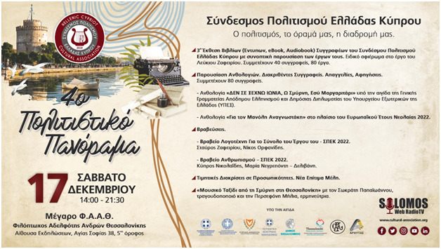 Το Σάββατο 17 Δεκεμβρίου 2022, στις 14:00 ώρα Ελλάδος, για τέταρτη συνεχή χρονιά, λαμβάνει χώρα η ετήσια, καθιερωμένη εκδήλωση του Συνδέσμου Πολιτισμού Ελλάδας Κύπρου στο Μέγαρο Φ.Α.Α.Θ., στην αίθουσα εκδηλώσεων του 5ου ορόφου της Φιλοπτώχου Αδελφότητος Ανδρών Θεσσαλονίκης, επί της οδού Αγίας Σοφίας 38, στο κέντρο της Θεσσαλονίκης. Το 4ο Πολιτιστικό Πανόραμα του Συνδέσμου Πολιτισμού Ελλάδας Κύπρου πραγματοποιείται υπό την αιγίδα της Γενικής Γραμματείας Απόδημου Ελληνισμού και Δημόσιας Διπλωματίας του Υπουργείου Εξωτερικών της Ελλάδος, του Υπουργείου Εσωτερικών – Τομέας Μακεδονίας Θράκης, της Περιφέρειας Κεντρικής Μακεδονίας, του Δήμου Θεσσαλονίκης και του Οργανισμού Τουρισμού Θεσσαλονίκης, σε συνεργασία με τον εκδοτικό οργανισμό Αρχύτας. Λήξη εκδήλωσης 21:30.