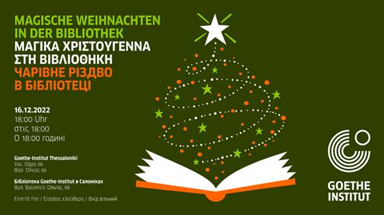 Τα Χριστούγεννα είναι προ των πυλών και το Goethe-Institut Thessaloniki προσκαλεί με χαρά μικρούς φίλους και φίλες σε μια ξεχωριστή χριστουγεννιάτικη γιορτή στη βιβλιοθήκη του! Φέτος, η πρόσκλησή μας απευθύνεται και σε ουκρανικές οικογένειες με μικρά παιδιά που ζουν στην πόλη μας, για τις οποίες έχουμε ετοιμάσει μια ιδιαίτερη έκπληξη! Ελάτε με όλη την οικογένεια να περάσουμε ένα όμορφο απόγευμα γεμάτο εορταστικές δραστηριότητες: • Ανάγνωση χριστουγεννιάτικου παραμυθιού (σε Γερμανική, Ελληνική και Ουκρανική γλώσσα) • Χριστουγεννιάτικες χειροτεχνίες • Εργαστήρι ζωγραφικής: «Ζωγραφίζουμε παρέα τη βαλίτσα του Άγιου Βασίλη»