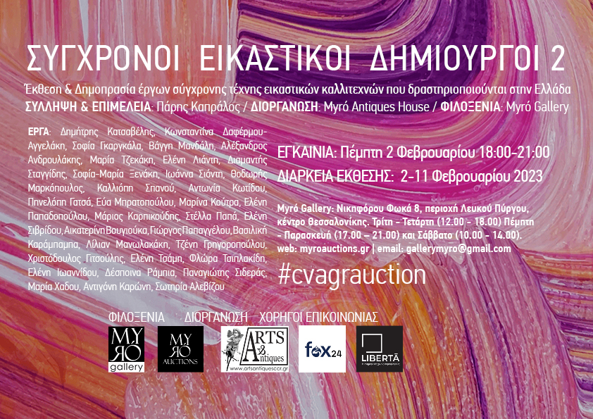 *Εγκαίνια: Πέμπτη 2 Φεβρουαρίου Διάρκεια έκθεσης: έως 11 Φεβρουαρίου 2023 | Ώρες / Μέρες λειτουργίας φυσικής έκθεσης: Τρίτη – Τετάρτη (12.00 – 18.00) Πέμπτη – Παρασκευή (17.00 – 21.00) και Σάββατο (10.00 – 14.00) | Φυσική έκθεση των έργων: Myrό Gallery, Νικηφόρου Φωκά 8, 546 21, περιοχή Λευκού Πύργου, Θεσσαλονίκη | Διαδικτυακή έκθεση / δημοπρασία: https://myroauctions.gr | Εκκίνηση Δημοπρασίας: Πέμπτη 2 Φεβρουαρίου στις 18:00 | Κατάληξη Δημοπρασίας: Δευτέρα 13 Φεβρουαρίου 2023 στις 18:00