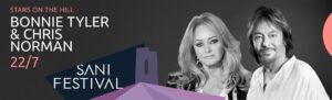 Τ: +30 2314 400 800 – E: sanifestival@saniresort.gr/ Εισιτήρια-Τιμές εισιτηρίων: από 30€ – 180€ / Προπώληση:SF2023-Bonnie Tyler & Chris Norman | Εισιτήρια online! | Viva.gr / Επίσημα σημεία πώλησης εισιτηρίων των εκδηλώσεων της ΣΑΝΗ Α.Ε. είναι αποκλειστικά τα εκδοτήριά της, τα αναφερόμενα σημεία στα ξενοδοχεία του Sani Resort, η επίσημη ιστοσελίδα της viva.gr και τα συνεργαζόμενα αυτής φυσικά δίκτυα.